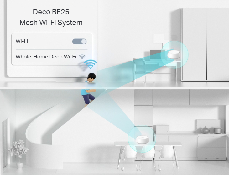 Deco BE25 tương thích với mọi model Deco khác để tạo thành mạng Mesh. Mở rộng phạm vi phủ sóng WiFi Mesh bất kỳ lúc nào bằng cách thêm nhiều Deco hơn.