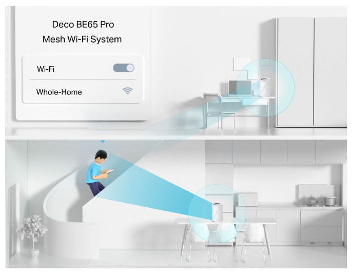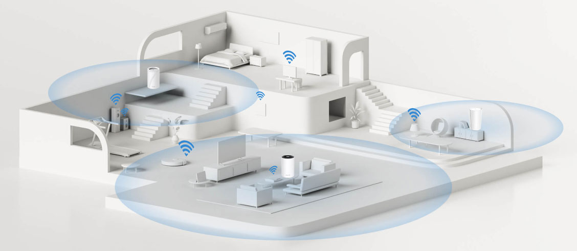 Deco BE65 Pro loại bỏ các khu vực tín hiệu yếu bằng WiFi toàn nhà mạnh hơn, rõ hơn nhờ công nghệ Coloring và Beamforming của BSS (Trạm dịch vụ cơ sở) giúp loại bỏ vùng chết WiFi.