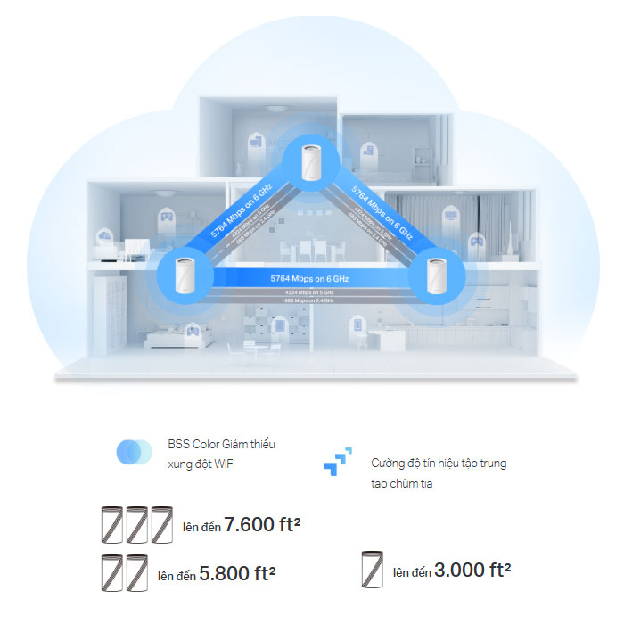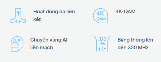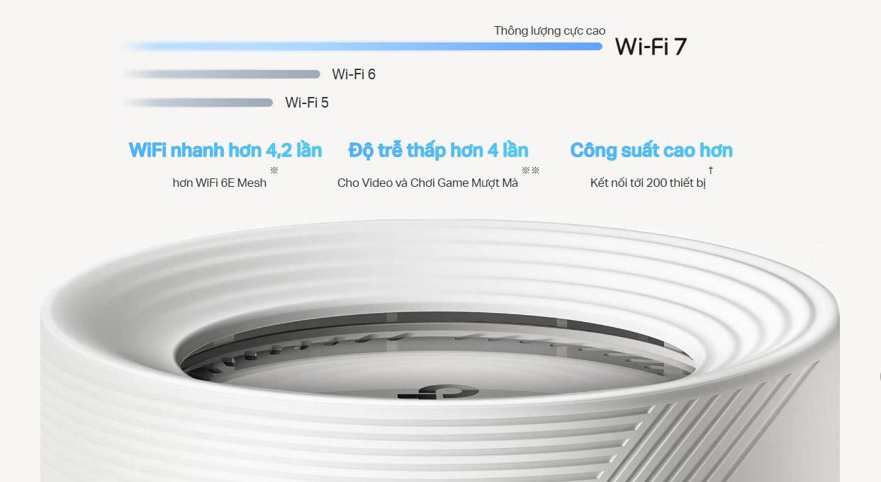 △Sử dụng Wi-Fi 7 (802.11be), Wi-Fi 6 (802.11ax) và các tính năng bao gồm Hoạt động đa liên kết (MLO), Băng thông 320 MHz, 4K-QAM, Multi-RU, OFDMA, MU-MIMO và BSS Màu sắc yêu cầu khách hàng cũng phải hỗ trợ các tính năng tương ứng. Băng thông 320 MHz chỉ khả dụng trên băng tần 6 GHz. Đồng thời, băng thông 160 MHz và 240 MHz hoặc băng thông 320 MHz có thể không khả dụng tương ứng trên băng tần 5 GHz hoặc băng tần 6 GHz ở một số vùng/quốc gia do các hạn chế về quy định. Độ rộng và tốc độ kênh đôi đề cập đến 320 MHz so với 160 MHz của lưới Wi-Fi 6.
