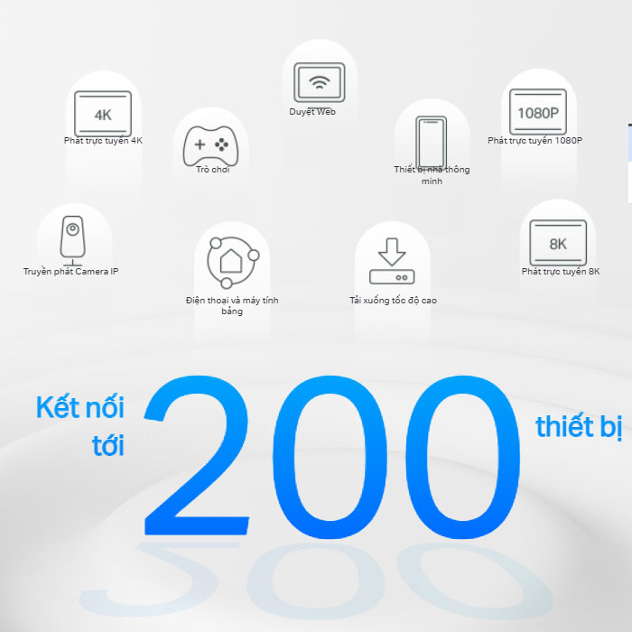 †Tốc độ tín hiệu không dây tối đa là tốc độ vật lý bắt nguồn từ thông số kỹ thuật của Tiêu chuẩn IEEE 802.11. Kết nối với hơn 200 thiết bị dựa trên dữ liệu thử nghiệm trong phòng thí nghiệm, dữ liệu này đã phân tích kết nối của các thiết bị khác nhau trên các băng tần 6 GHz, 5 GHz và 2,4 GHz cùng một lúc. Các thiết bị này mô phỏng một kịch bản gia đình điển hình bằng cách chạy các ứng dụng đồng thời trong cùng một phòng bao gồm video 4K, video 1080p, video 720p, tải xuống tệp, duyệt web, camera IP và các thiết bị IoT khác. Thông lượng dữ liệu không dây thực tế, phạm vi phủ sóng không dây và các thiết bị được kết nối không được đảm bảo và sẽ thay đổi do các yếu tố của nhà cung cấp dịch vụ internet, điều kiện mạng, giới hạn của khách hàng và các yếu tố môi trường, bao gồm vật liệu xây dựng, chướng ngại vật, khối lượng và mật độ lưu lượng truy cập cũng như vị trí khách hàng.