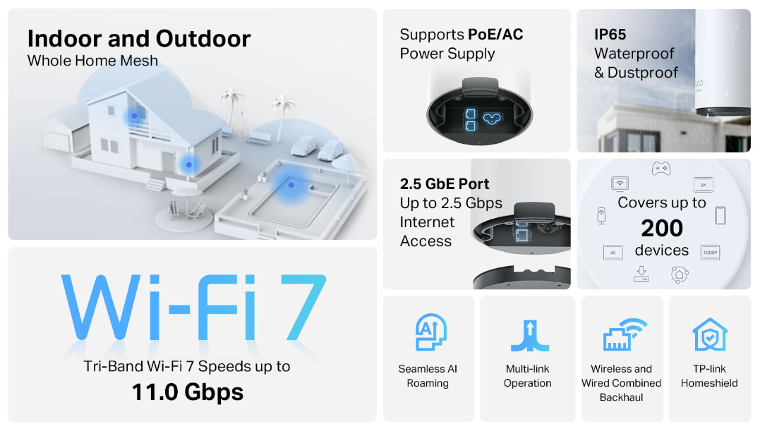 △Việc sử dụng Wi-Fi 7 (802.11be), Wi-Fi 6 (802.11ax) và các tính năng bao gồm Multi-Link Operation (MLO), Băng thông 320 MHz, 4K-QAM, Multi-RUs, OFDMA, MU-MIMO và BSS Color yêu cầu thiết bị khách cũng phải hỗ trợ các tính năng tương ứng. Băng thông 320 MHz chỉ khả dụng trên băng tần 6 GHz. Đồng thời, băng thông 160 MHz và 240 MHz hoặc băng thông 320 MHz có thể không khả dụng trên băng tần 5 GHz hoặc 6 GHz ở một số khu vực/quốc gia do hạn chế về quy định. Chiều rộng kênh và tốc độ tăng gấp đôi đề cập đến 320 MHz so với 160 MHz của Wi-Fi 6 mesh.