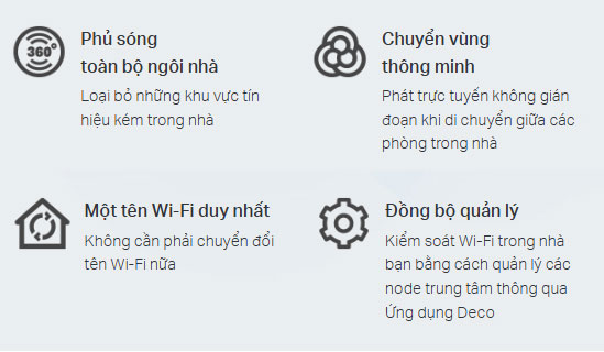 Các Deco hoạt động cùng nhau để tạo thành một mạng thống nhất. Điện thoại hoặc máy tính bảng của bạn sẽ tự động kết nối với Deco nhanh nhất khi bạn di chuyển trong nhà, tạo ra trải nghiệm trực tuyến thực sự liền mạch. Hỗ trợ cho chuẩn IEEE 802.11r cũng như 802.11k/v. Điều đó giúp việc chuyển đổi từ Deco này sang Deco khác rất mượt mà, ngay cả khi bạn đang phát video trực tiếp.