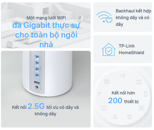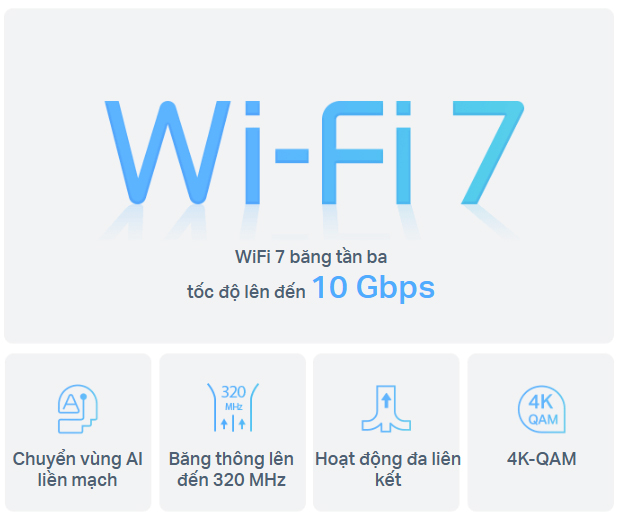 | Chức năng nâng cao | • Hoạt động đa liên kết (MLO) • Kênh 320 MHz • 4K-QAM • Nhiều RU • Hoạt động với Alexa và Google Assistant |