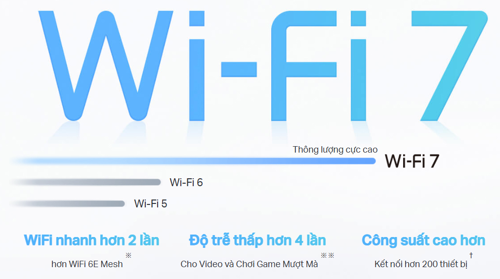 △ Việc sử dụng Wi-Fi 7 (802.11be), Wi-Fi 6 (802.11ax) và các tính năng bao gồm Multi-Link Operation (MLO), Băng thông 320 MHz, 4K-QAM, Multi-RU, OFDMA, MU-MIMO và BSS Color yêu cầu máy khách cũng phải hỗ trợ các tính năng tương ứng. Băng thông 320 MHz chỉ khả dụng trên băng tần 6 GHz. Đồng thời, băng thông 160 MHz và 240 MHz hoặc băng thông 320 MHz có thể không khả dụng trên băng tần 5 GHz hoặc băng tần 6 GHz tương ứng ở một số khu vực/quốc gia do các hạn chế về quy định. Độ rộng và tốc độ kênh đôi đề cập đến 320 MHz so với 160 MHz đối với Wi-Fi 6 dạng lưới.