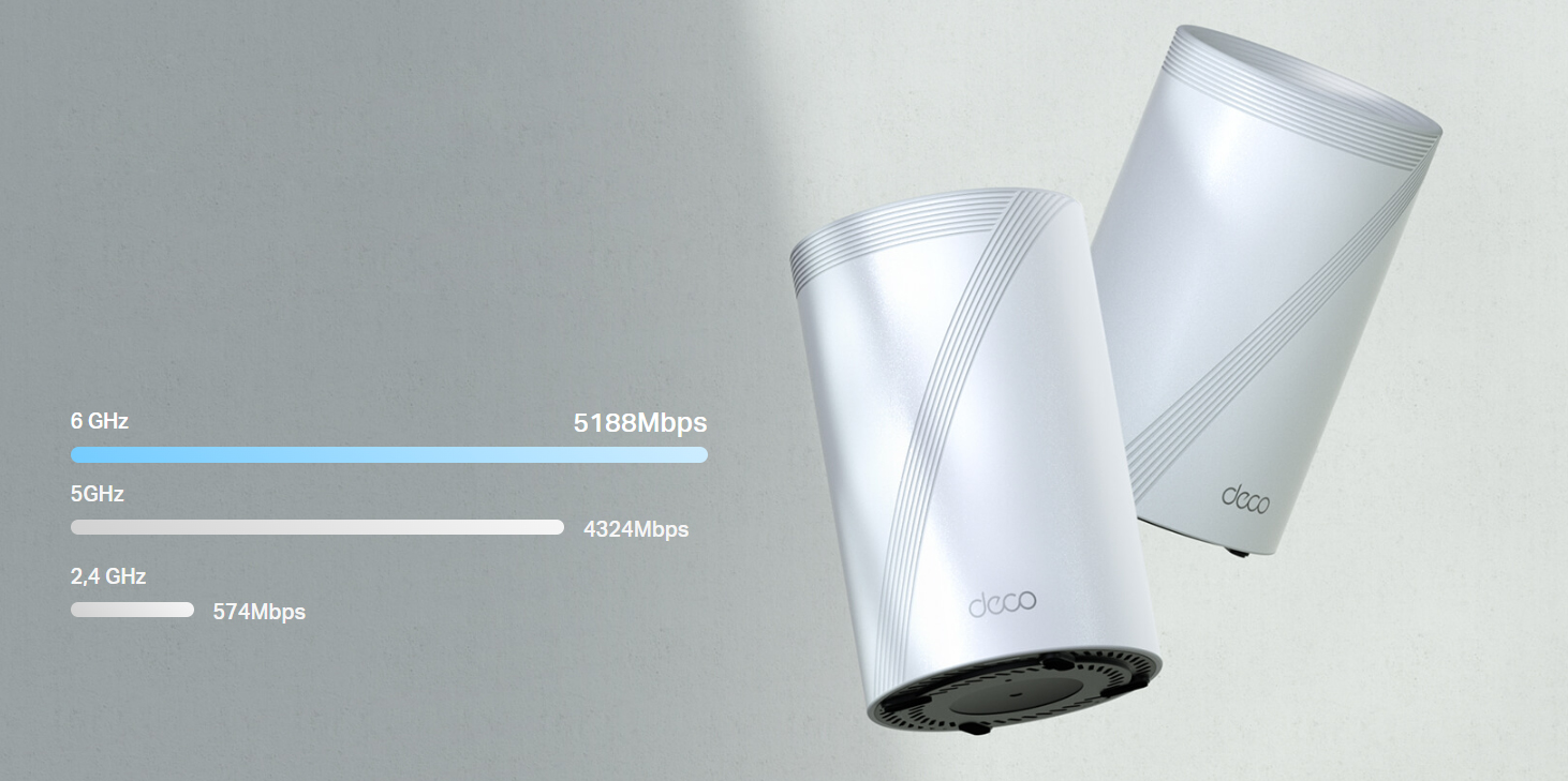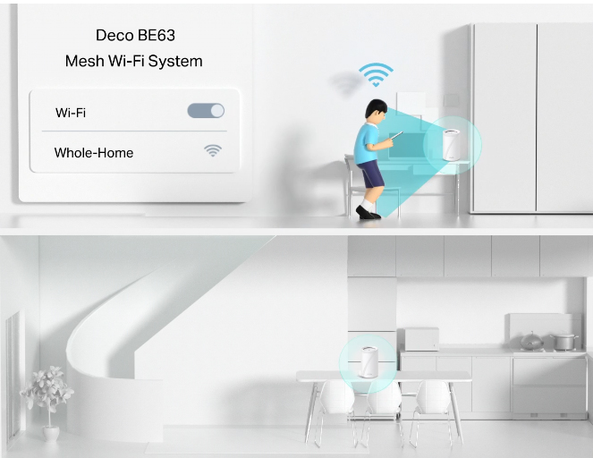 ※ Tốc độ Wi-Fi nhanh hơn 2 lần đề cập đến tốc độ lý thuyết của máy khách Wi-Fi 7 khi được kết nối với Deco BE63 so với mạng lưới Wi-Fi 6 hoặc Wi-Fi 6E. Máy khách Wi-Fi 7 cần hỗ trợ Multi-Link Operation (MLO) và băng tần 6 GHz để đạt tới 10 Gbps khi được kết nối đồng thời với băng tần 5 GHz và 6 GHz của Deco BE63. Wi-Fi 6 và mạng lưới Wi-Fi 6E chỉ có thể cung cấp 4804 Mbps trên băng tần 5 GHz hoặc 6 GHz riêng biệt.