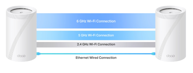 Nhờ công nghệ do chính chúng tôi phát triển, Deco BE63 có thể kết nối backhaul không dây và có dây với từng thiết bị cùng lúc. Hơn nữa, với công nghệ WiFi 7 MLO mới nhất, tốc độ luồng tổng hợp backhaul kết hợp không dây và có dây của hệ thống được tăng lên. Theo cách này, nó cải thiện đáng kể thông lượng tổng thể và giảm độ trễ, cung cấp phạm vi phủ sóng rộng hơn với các kết nối ổn định và đáng tin cậy hơn.