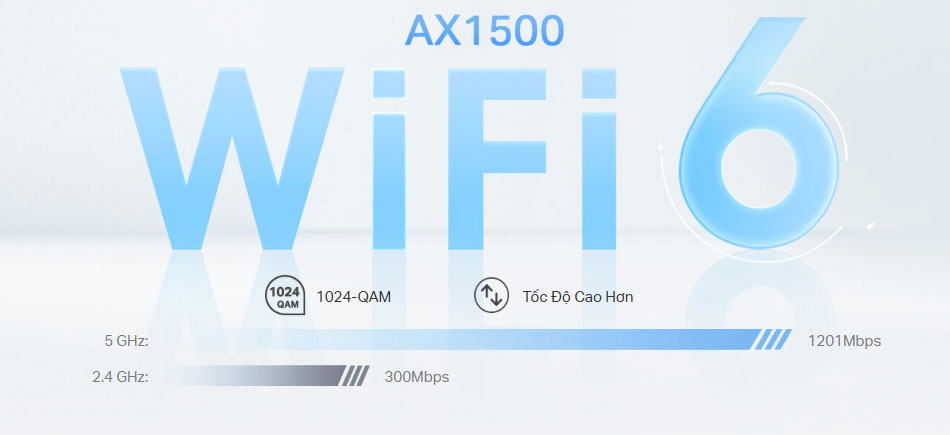 - Kết nối nhanh hơn: Tốc độ Wi-Fi 6 lên tới 1.500 Mbps—1.201 Mbps trên 5 GHz và 300 Mbps trên 2,4 GHz.†