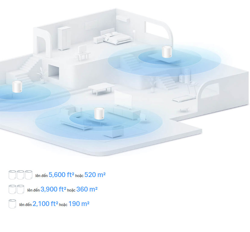 Lưu ý: Phạm vi phủ sóng thay đổi từ 5,600 ft2 (3-pack), 3,900 ft2 (2-pack), to 2,100 ft2 (1-pack). †
