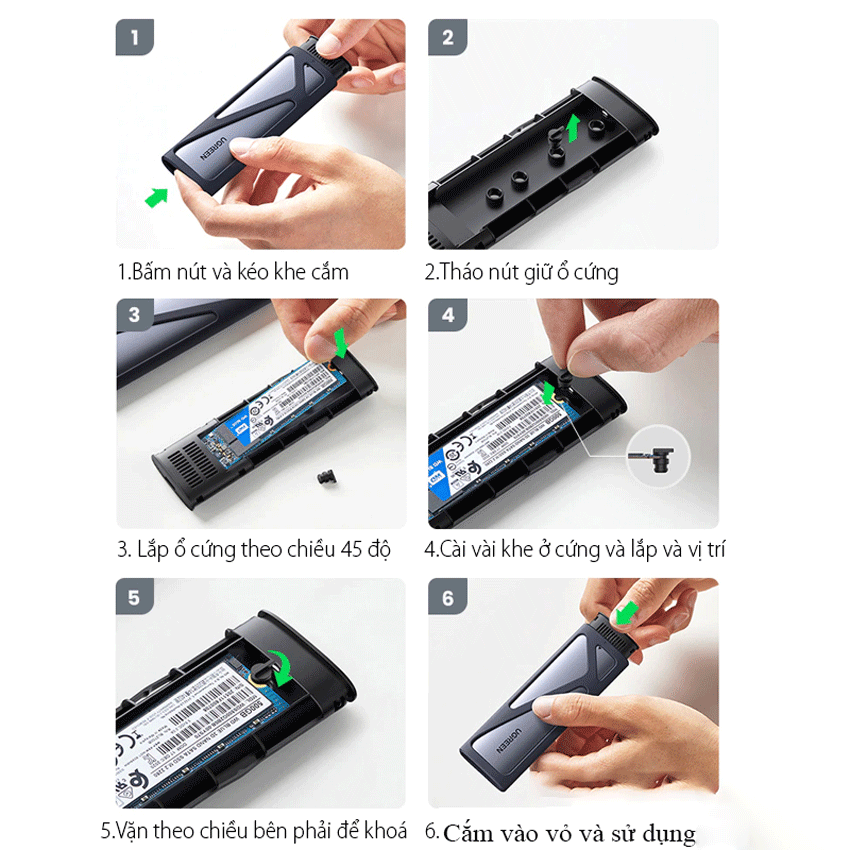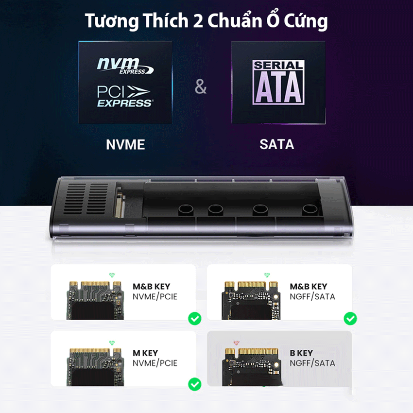 Box M.2 sata USB 3.2 GEN 2 Type-C UGREEN 90264 thiết kế vừa vặn mọi kích thước của ổ cứng 2230, 2242, 2260, 2280 lên đến 2TB.