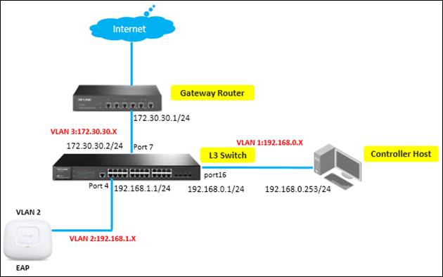 Trong cấu trúc liên kết mạng bên dưới, có ba VLAN (ba subnet), đó là VLAN1 (192.168.0.0/24), VLAN2 (192.168.1.0/24) và VLAN3 (172.30.30.0/24). Ba VLAN (ba subnet) này được phân chia bởi TP-Link L3 Switch (T2600G-28TS). Bây giờ chúng ta muốn TP-Link EAP Controller trong VLAN1 (192.168.0.0/24) quản lý EAP trong VLAN2 (192.168.1.0/24). Router gateway là router TP-Link SMB TL-ER6120.