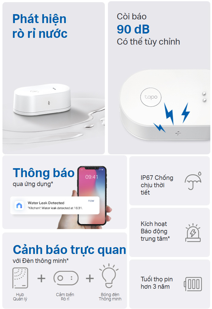 - Cần có Hub quản lý - Kích hoạt báo động của Hub khi phát hiện rò rỉ. Một Hub có thể quản lý đến 64 bộ cảm biến.