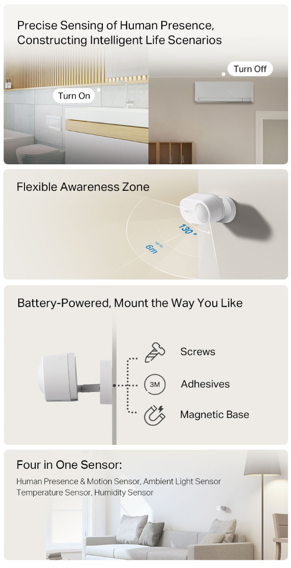 Tích hợp bốn chức năng phát hiện - Chuyển động/Tĩnh, Ánh sáng xung quanh, Nhiệt độ, Độ ẩm