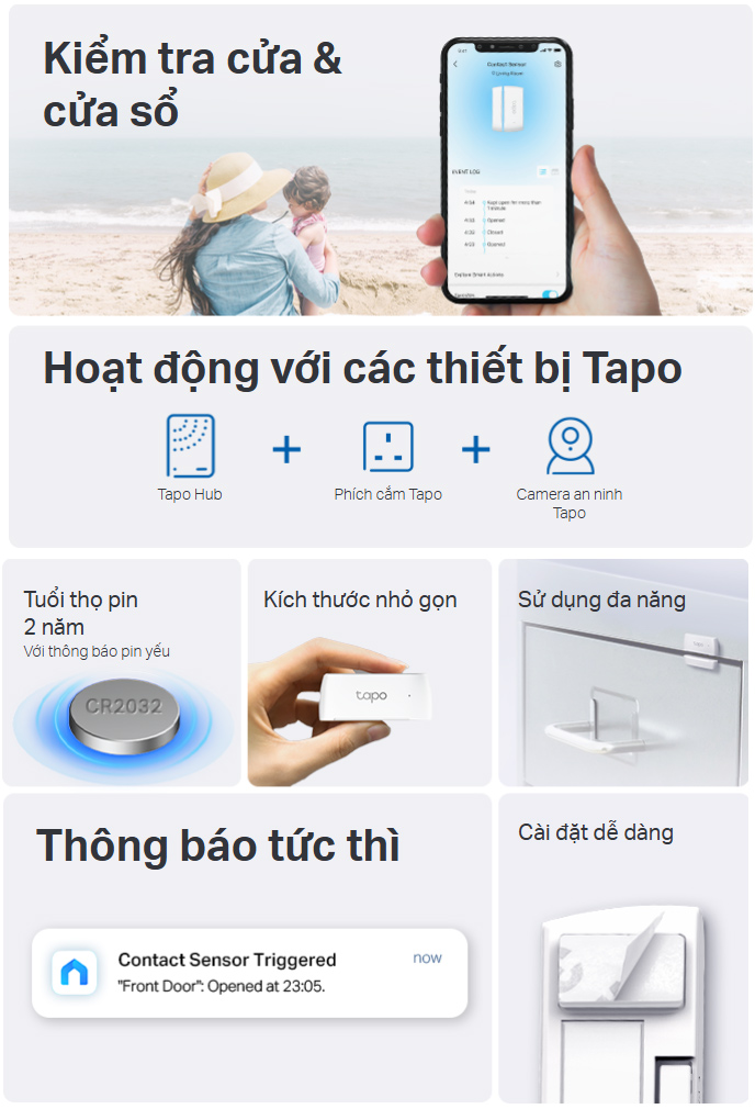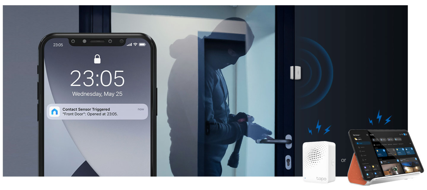 Bạn có thể thiết lập bộ cảm biến Tapo T110 để kích hoạt đèn tự động khi mở cửa, tăng thêm sự tiện lợi. Đặc biệt, bạn sẽ nhận thông báo tức thì trên điện thoại nếu cửa ra vào hoặc cửa sổ bị mở bất ngờ. Khi đó, Hub thông minh ví dụ như Tapo H10 (kết nối với cảm biến) có thể phát ra còi báo động lớn để cảnh báo nguy hiểm và xua đuổi kẻ xâm nhập.