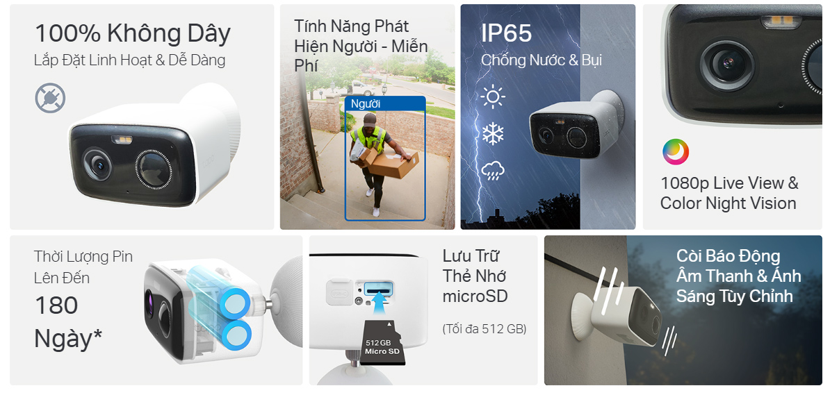 * Tuổi thọ pin 180 ngày dựa trên các thử nghiệm trong phòng thí nghiệm Tapo với 250 lần sử dụng mỗi ngày. Thời gian sử dụng bao gồm ghi hình và xem chế độ xem trực tiếp. Tuổi thọ pin thực tế có thể thay đổi tùy theo cài đặt thiết bị, cách sử dụng, thông số kỹ thuật của bộ định tuyến và các yếu tố môi trường.
