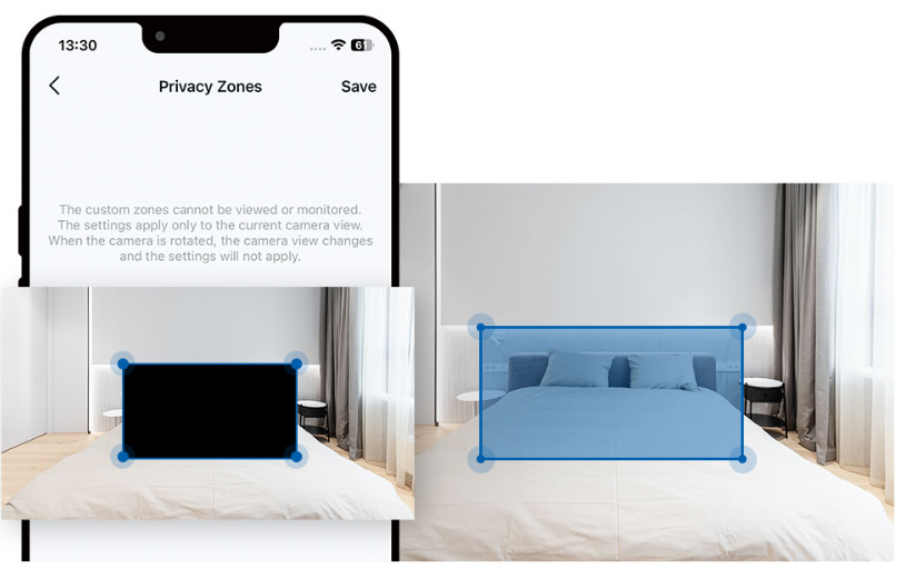 Lọc bỏ các khu vực riêng tư như giường ngủ, chỉ ghi lại những vị trí cần giám sát như cửa ra vào hoặc cửa sổ, đảm bảo quyền riêng tư luôn được bảo mật.
