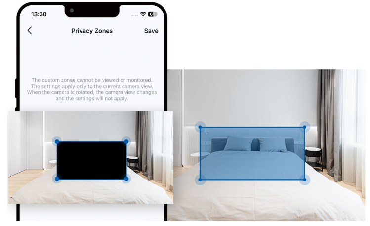 Lọc bỏ các khu vực riêng tư như giường ngủ, chỉ ghi lại những vị trí cần giám sát như cửa ra vào hoặc cửa sổ, đảm bảo quyền riêng tư luôn được bảo mật.