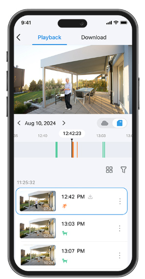 Nhanh chóng tìm và tải về những khoảnh khắc quan trọng bằng cách chọn loại sự kiện hoặc kéo thanh thời gian.