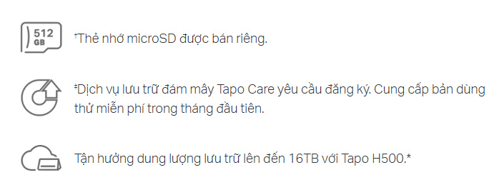 Lưu video đã ghi vào thẻ nhớ microSD† (tối đa 512 GB), Tapo H500 (tối đa 16TB*), hoặc sử dụng dịch vụ lưu trữ đám mây Tapo Care.