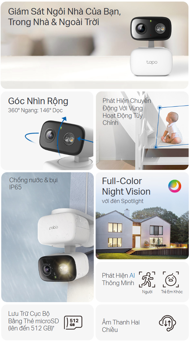 - Lưu Trữ Linh Hoạt: Lưu video vào thẻ nhớ microSD (lên đến 512 GB) hoặc sử dụng dịch vụ lưu trữ đám mây Tapo Care.