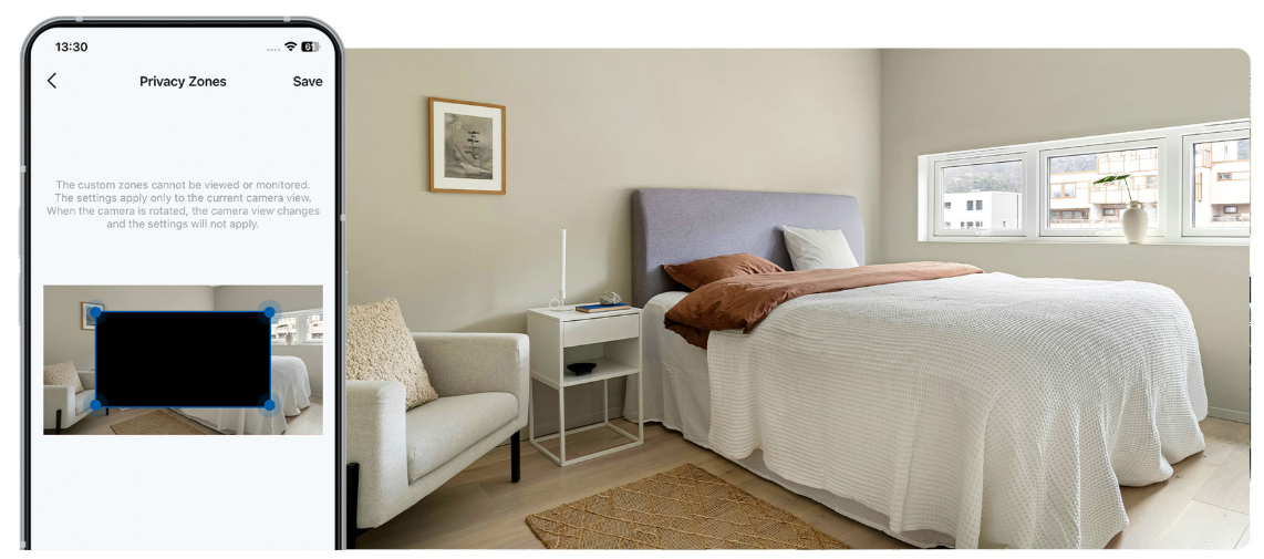 Tạo vùng chặn tùy chỉnh để ngăn chặn camera ghi hình những khu vực riêng tư, giúp bạn không phải lo lắng về việc bị rò rỉ khoảnh khắc cá nhân. Lọc bỏ những không gian riêng tư, như giường ngủ, và chỉ ghi hình những khu vực cần giám sát như cửa ra vào và cửa sổ để bảo vệ tối đa quyền riêng tư của bạn..