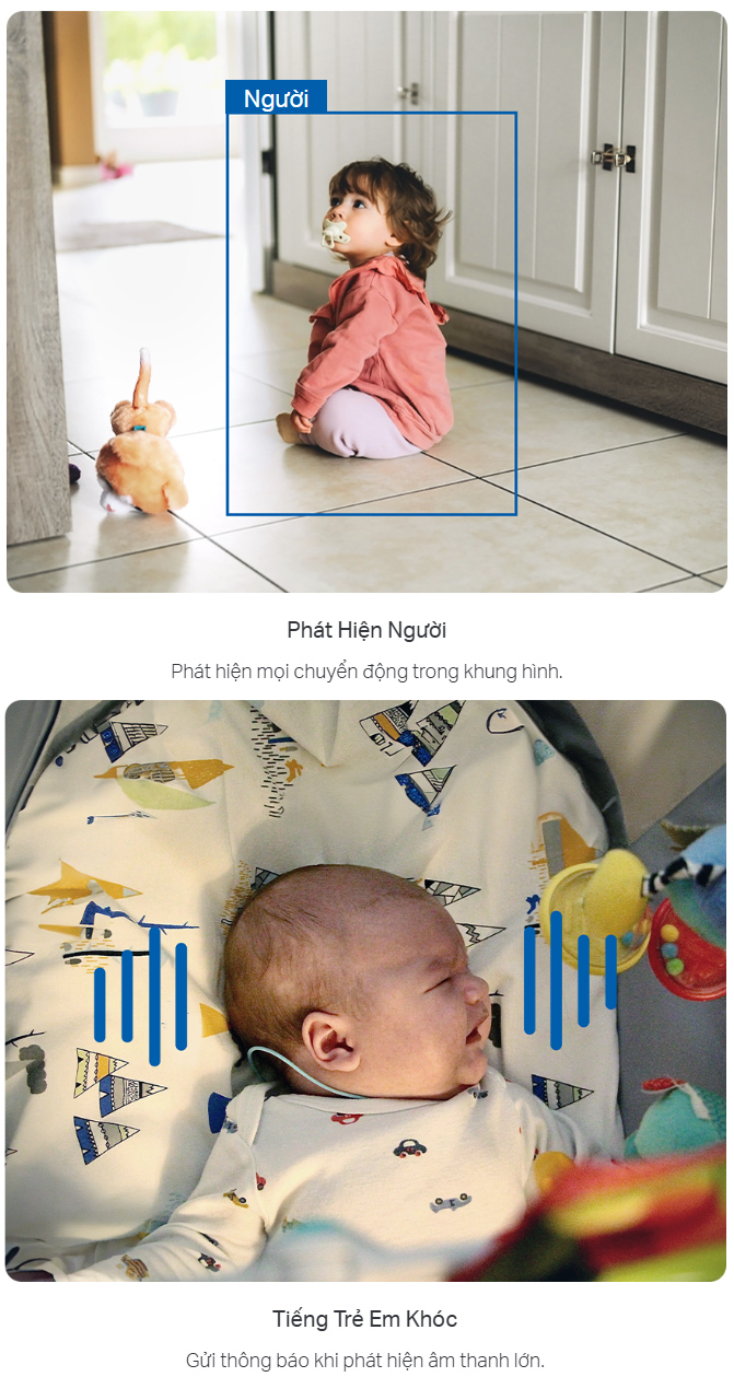- Phát hiện AI thông minh và gửi thông báo: Nhận diện con người, phát hiện tiếng khóc trẻ em và thông báo đến người dùng khi cần thiết.