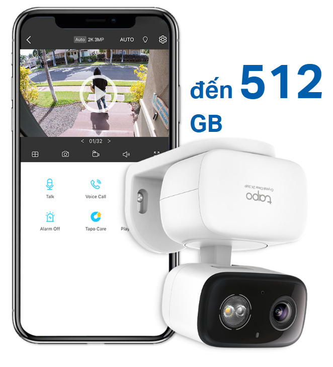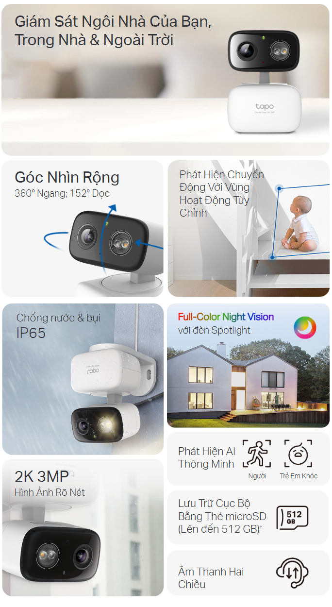 - Lưu trữ cục bộ và trên đám mây: Hỗ trợ thẻ nhớ microSD (tối đa 512 GB) và dịch vụ lưu trữ đám mây Tapo Care.