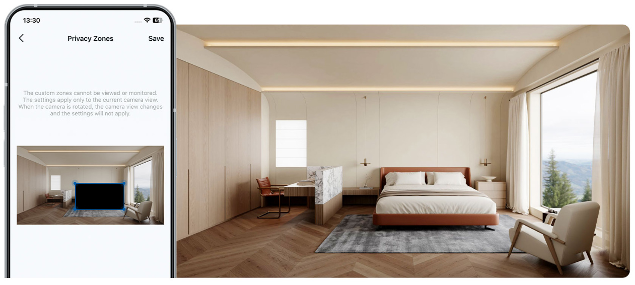Tạo vùng chặn tùy chỉnh để ngăn chặn camera ghi hình những khu vực riêng tư, giúp bạn không phải lo lắng về việc bị rò rỉ khoảnh khắc cá nhân. Lọc bỏ những không gian riêng tư, như giường ngủ, và chỉ ghi hình những khu vực cần giám sát như cửa ra vào và cửa sổ để bảo vệ tối đa quyền riêng tư của bạn.