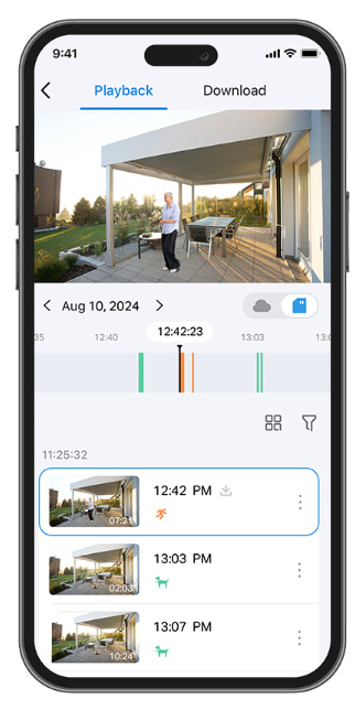 Nhanh chóng tìm và tải về những khoảnh khắc quan trọng bằng cách chọn loại sự kiện hoặc kéo thanh thời gian.