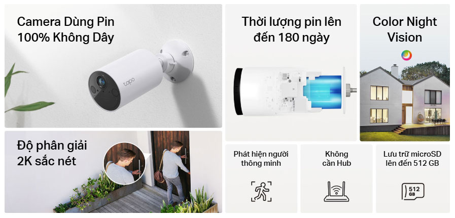 - Tùy chọn lưu trữ linh hoạt: Lựa chọn từ lưu trữ microSD cục bộ lên đến 512GB hoặc dịch vụ đám mây Tapo Care an toàn để có thêm sự yên tâm.