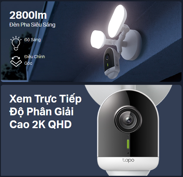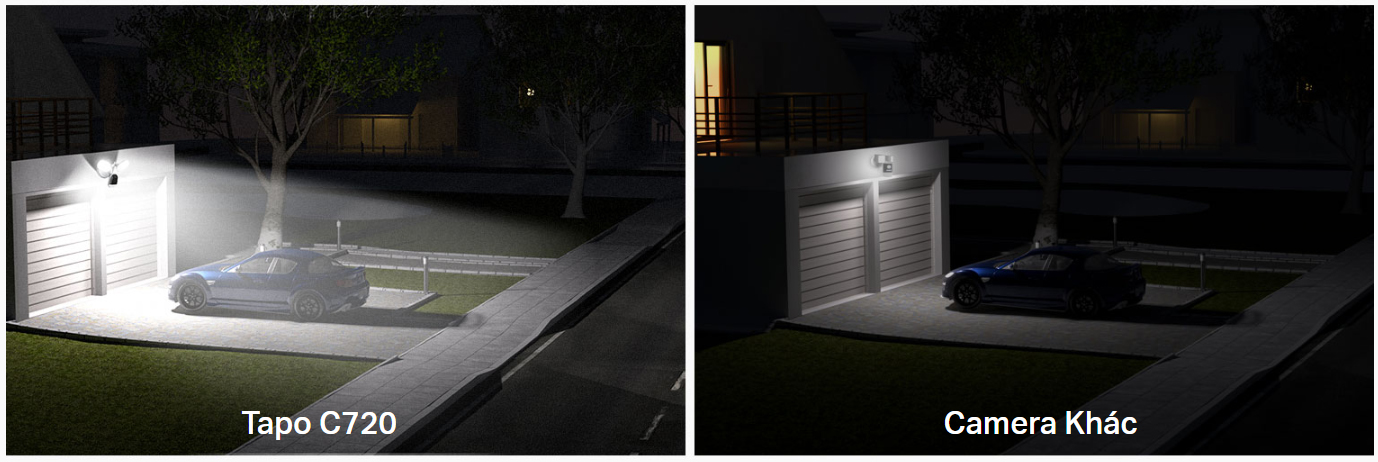 - Đèn chiếu sáng mạnh 2800 Lumen: Đèn chiếu sáng mạnh mẽ và dễ dàng tùy chỉnh của Tapo C720 cùng với khả năng nhìn đêm đủ màu sắc cho phép quan sát đến 10m, giúp bạn yên tâm khi biết rằng khu vực xung quanh luôn an toàn.