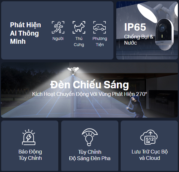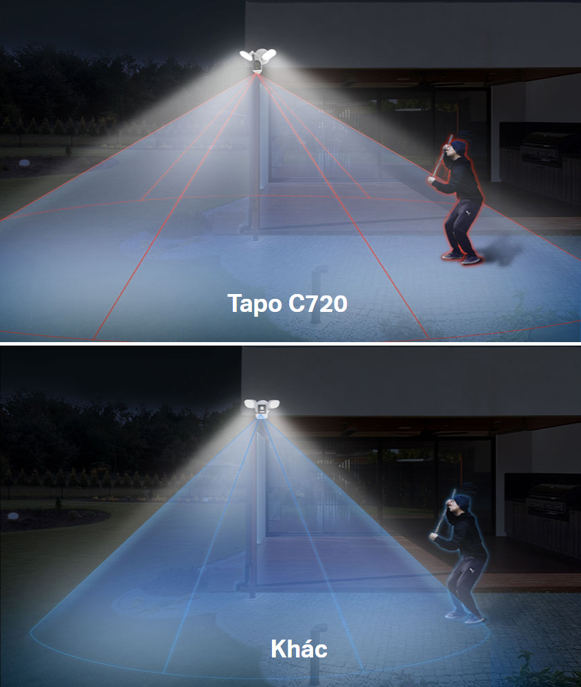 - Đèn chiếu sáng kích hoạt chuyển động: Với độ chính xác cao như diều hâu trong bóng tối, C720 phát hiện chuyển động, kích hoạt đèn chiếu sáng trên một khu vực rộng 270°.