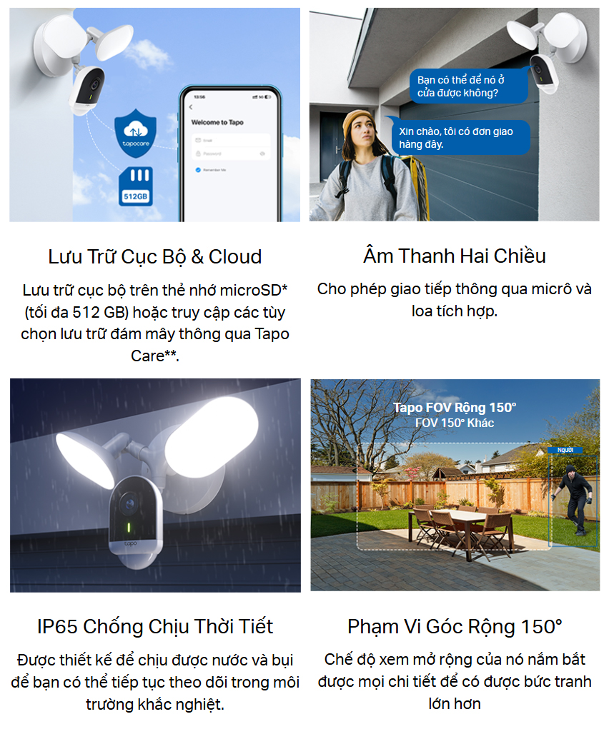 - Lưu trữ cục bộ hoặc đám mây: Lưu trữ và lưu video cục bộ trên thẻ microSD* (tối đa 512 GB) hoặc truy cập video bất cứ lúc nào, ở đâu với dịch vụ lưu trữ đám mây Tapo Care.**