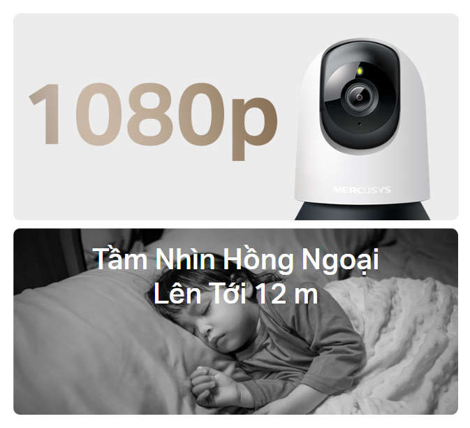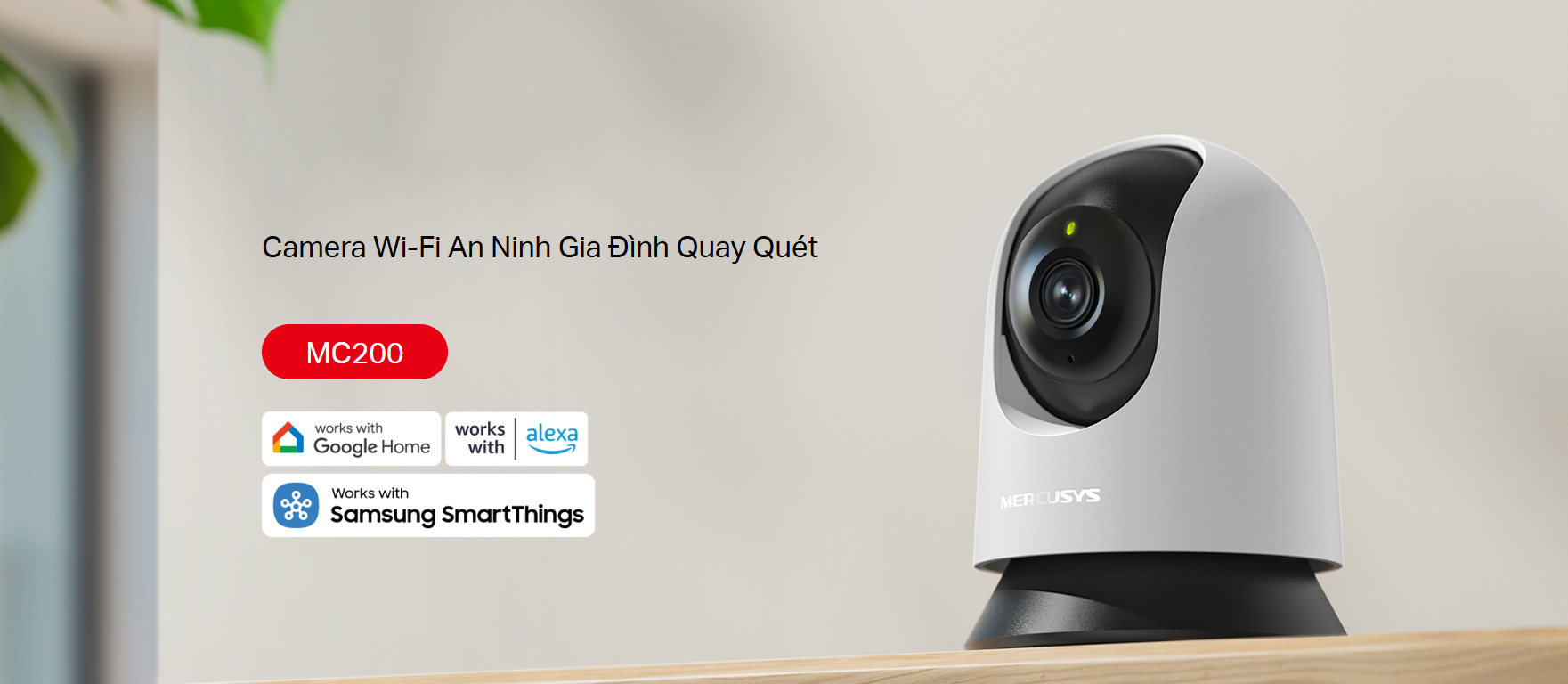 †Thẻ nhớ microSD được bán riêng. ‡Đăng ký lưu trữ đám mây tại https://www.mercusys.com/cameracare/ §MC200 không có cổng Ethernet và chỉ có thể kết nối qua Wi-Fi. △Tương thích với màn hình hỗ trợ Alexa và Google Assistant. Trải nghiệm người dùng phụ thuộc vào thông số kỹ thuật của thiết bị được kết nối.