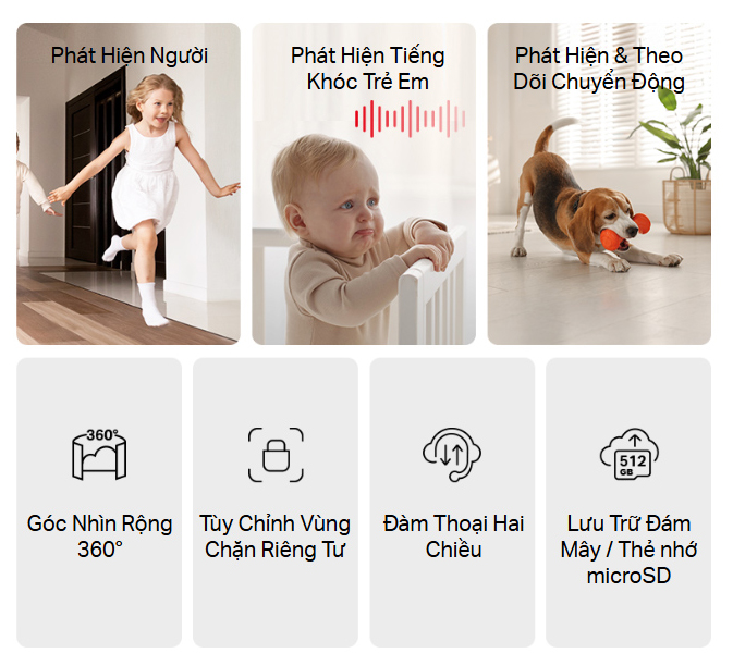 - Phát hiện thông minh - Theo dõi chuyển động thông minh 24/7, đảm bảo đối tượng luôn trong tầm nhìn, kể cả trong bóng tối nhờ chế độ nhìn đêm. Nhận cảnh báo ngay lập tức khi phát hiện chuyển động, con người hoặc tiếng khóc trẻ em.