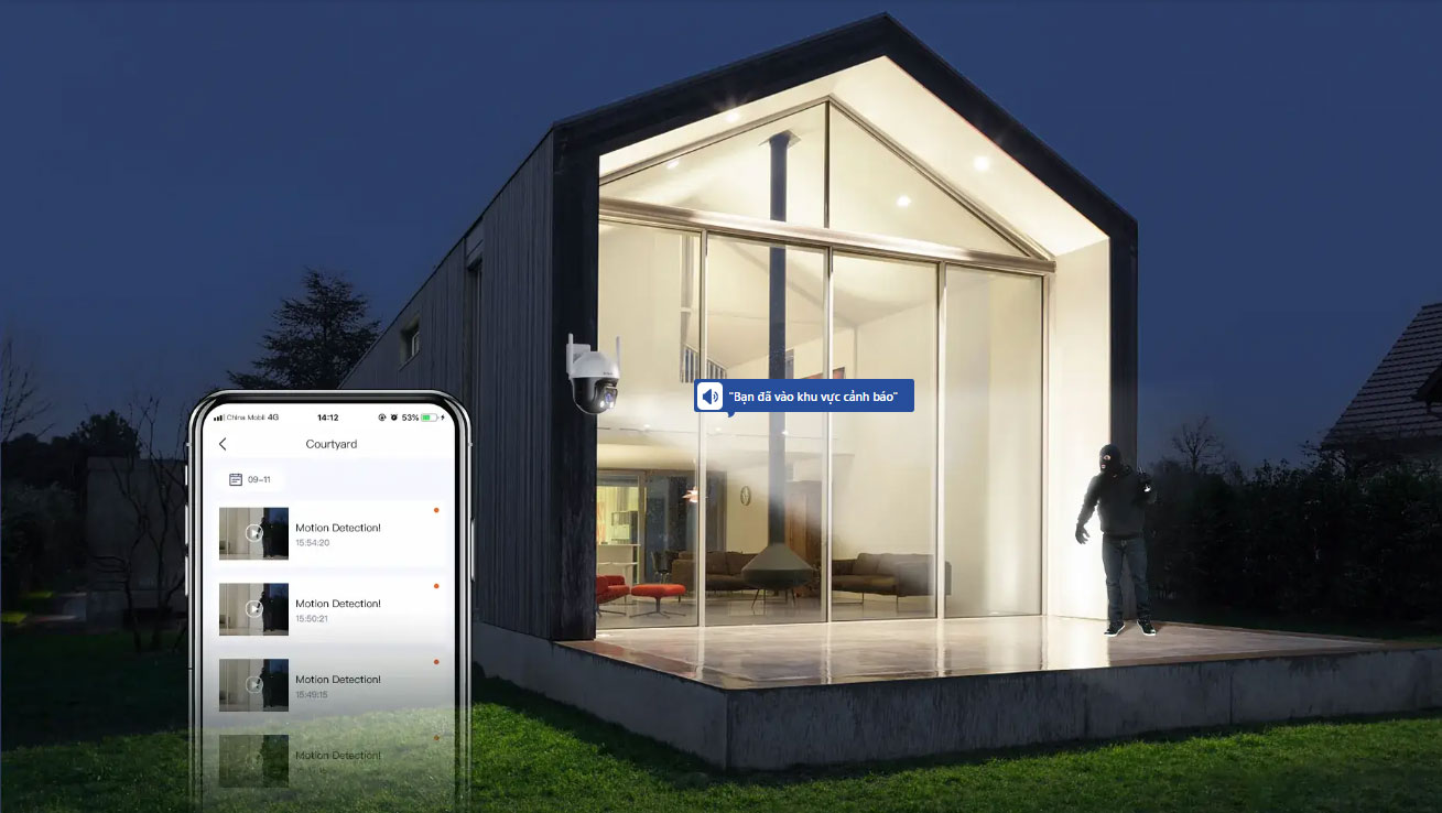 Khi có người vào khu vực giám sát, camera bật cảnh báo âm thanh kèm theo đèn nhấp nháy (có thể tùy chỉnh ba cảnh báo âm thanh), thông báo cảnh báo cũng sẽ được gửi đến điện thoại ngay lập tức.