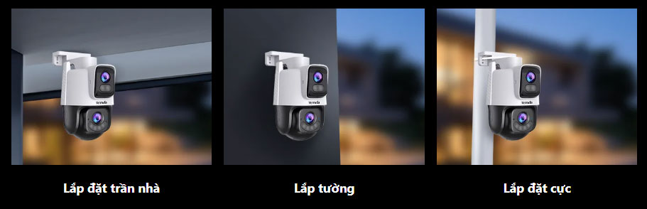 Camera có thể gắn trên trần nhà, tường bằng vít hoặc gắn trên cột bằng dây đeo.