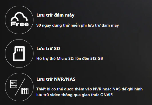 Video có thể được lưu trữ trong thẻ Micro SD cục bộ, đám mây và NVR/NAS. Ngay cả khi thiết bị của bạn bị phá hoại, bạn vẫn có thể khôi phục video dựa trên bản ghi đám mây.