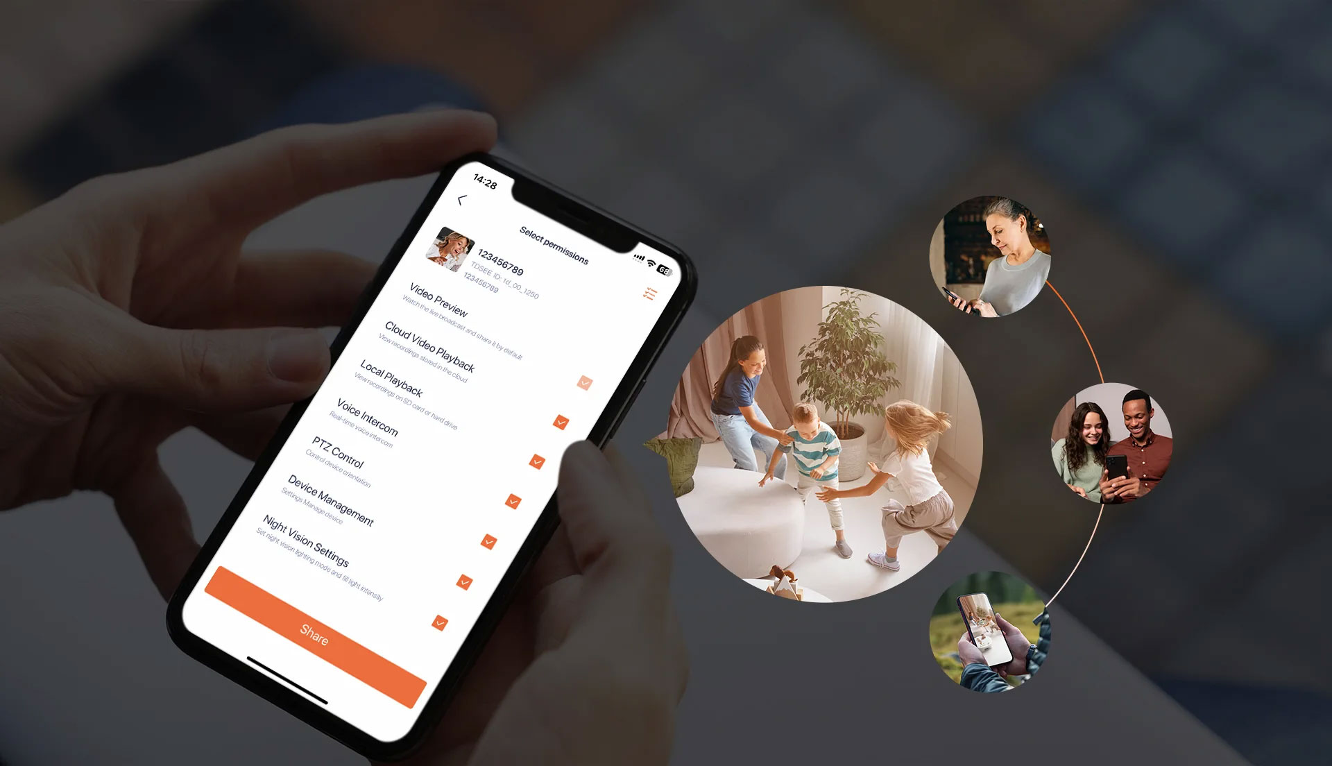 Tăng cường an toàn bằng cách chia sẻ camera với gia đình bạn. Mỗi thành viên có thể theo dõi tình hình gia đình và hợp tác để đảm bảo an ninh cho gia đình.
