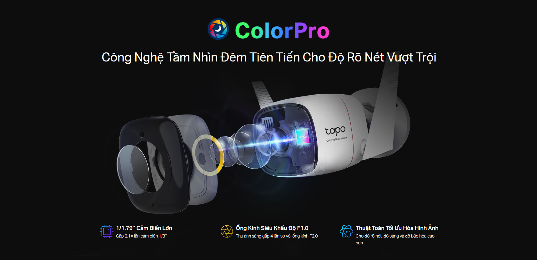 Không giống như các camera quan sát ban đêm có màu khác sử dụng đèn định vị hoặc đèn pha, Tapo C325WB sử dụng công nghệ ColorPro