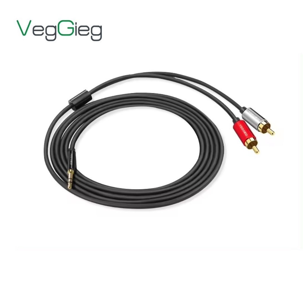 Cáp Audio VegGieg V-A402 chuyển đổi tín hiệu từ cổng 3.5mm sang 2 đầu RCA, dài 1.5m, vỏ bọc PVC màu đen, đầu nối mạ vàng, lõi đồng.