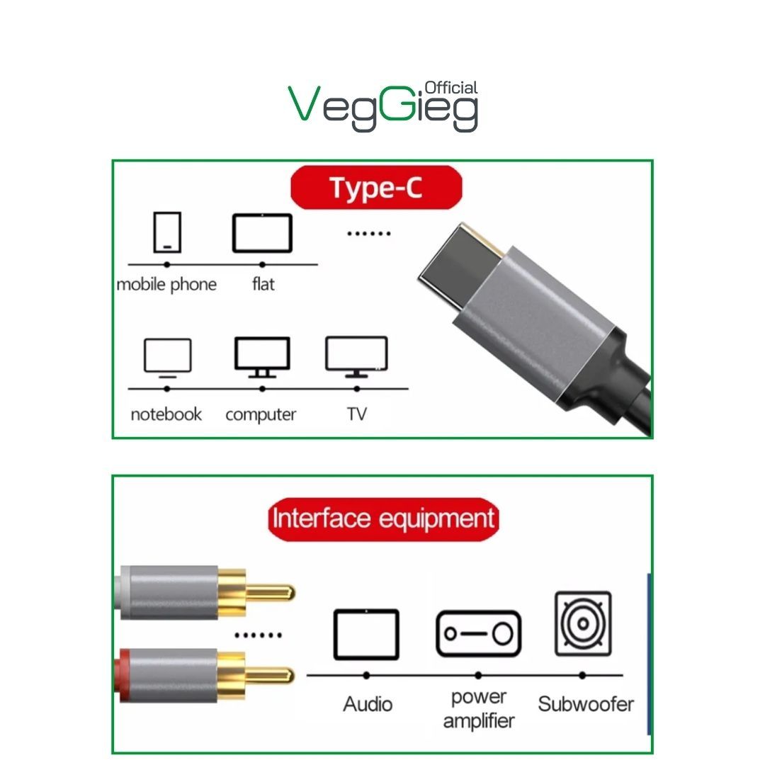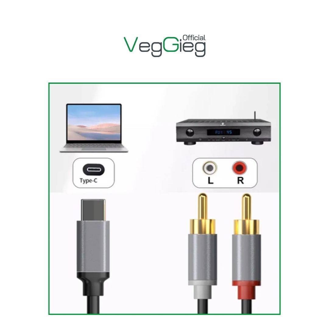 Cáp chuyển đổi VegGieg Type-C ra 2 Audio RCA V-A621 truyền âm thanh chất lượng cao: Kết nối trực tiếp từ điện thoại, máy tính bảng hoặc máy tính xách tay qua cổng USB-C đến thiết bị âm thanh 2RCA, không cần bộ chuyển đổi.