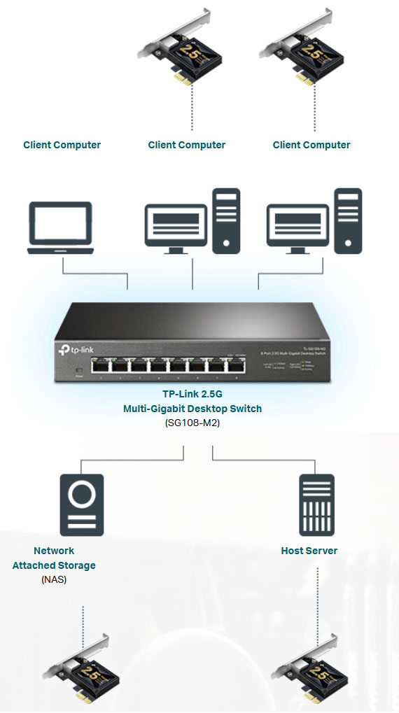 Đối với các kết nối cục bộ, Card mạng PCIe 2.5G giúp xây dựng một kênh truyền tải cực nhanh giữa thiết bị lưu trữ trung tâm và các máy tính khác trong mạng nội bộ của bạn. Việc truyền dữ liệu cục bộ sẽ trở nên dễ dàng hơn khi bạn xử lý các tác vụ yêu cầu băng thông cao tại nhà hoặc văn phòng.