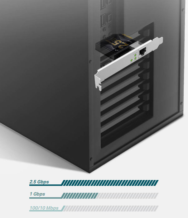 2.5G Base-T tương thích ngược với nhiều tốc độ dữ liệu, bao gồm 2.5 Gbps, 1 Gbps, 100 Mbps và 10 Mbps kết nối Base-T. Cổng Ethernet 2.5G tự động phẩn bổ giữa các kết nối tốc độ cao và thấp, cho phép bạn nâng cấp lên mạng 2.5G một cách dễ dàng.
