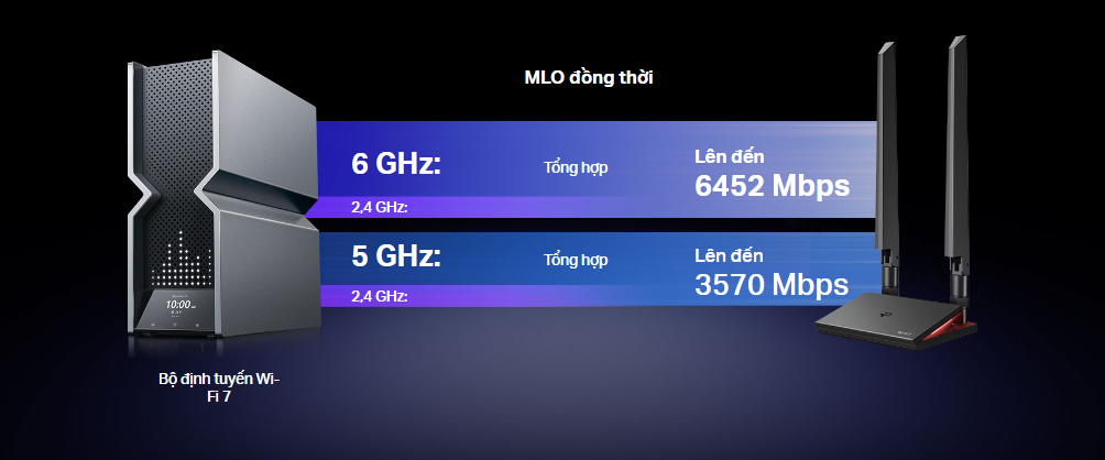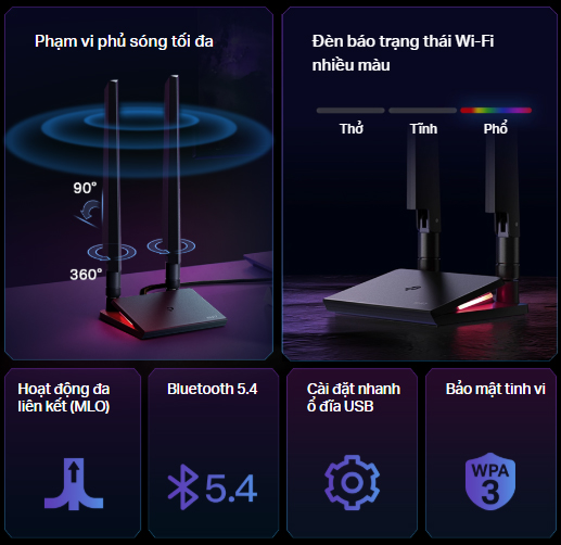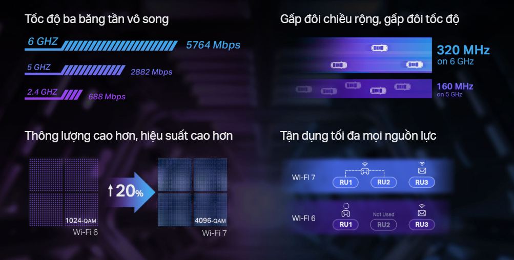 - Chuẩn Wi-Fi 7 — Khai thác toàn bộ tiềm năng của băng tần 6 GHz để tăng gấp đôi băng thông của thế hệ trước.