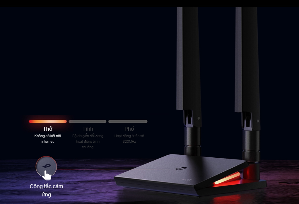 Với hiệu ứng đèn LED hấp dẫn, đế của Archer TBE550E không chỉ cung cấp khả năng hiển thị trực quan trạng thái mạng mà còn cho phép tùy chỉnh dễ dàng thông qua công tắc cảm ứng nhạy bén.