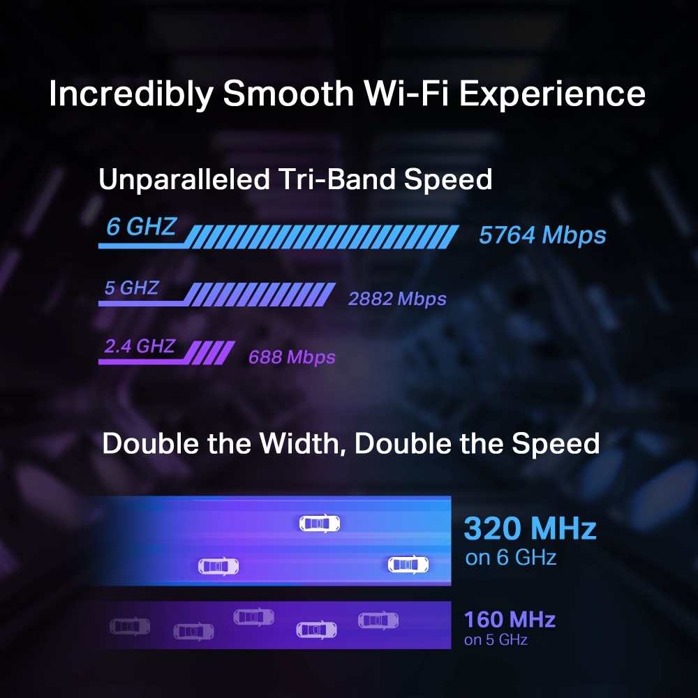- Tốc độ ba băng tần vô song — Tăng tốc độ tổng thể của bạn lên tới 5760 Mbps (6 GHz) + 2880 Mbps (5 GHz) + 688 Mbps (2,4 GHz )