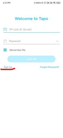 1. Để người được mời khởi chạy Ứng dụng Tapo, trước tiên hãy chọn “Đăng ký"("Sign up") để tạo ID TP-Link của riêng họ.