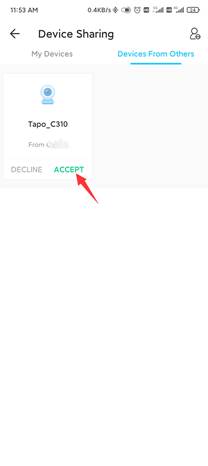 4. Cho phép người được mời đăng nhập vào ỨNG DỤNG Tapo, chọn lời mời trong Thiết Bị Từ Người Khác và nhấp CHẤP NHẬN (ACCEPT). Sau đó, người được mời có thể quản lý thiết bị chia sẻ ngay bây giờ.