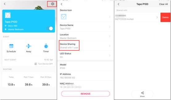Nếu bạn muốn ngừng chia sẻ thiết bị, đến Cài Đặt Thiết Bị-Chia Sẻ Thiết Bị (Device Settings-Device Sharing) và bạn sẽ thấy tài khoản bạn đã chia sẻ thiết bị, kéo nó sang bên trái và nhấp Xóa (Delete):