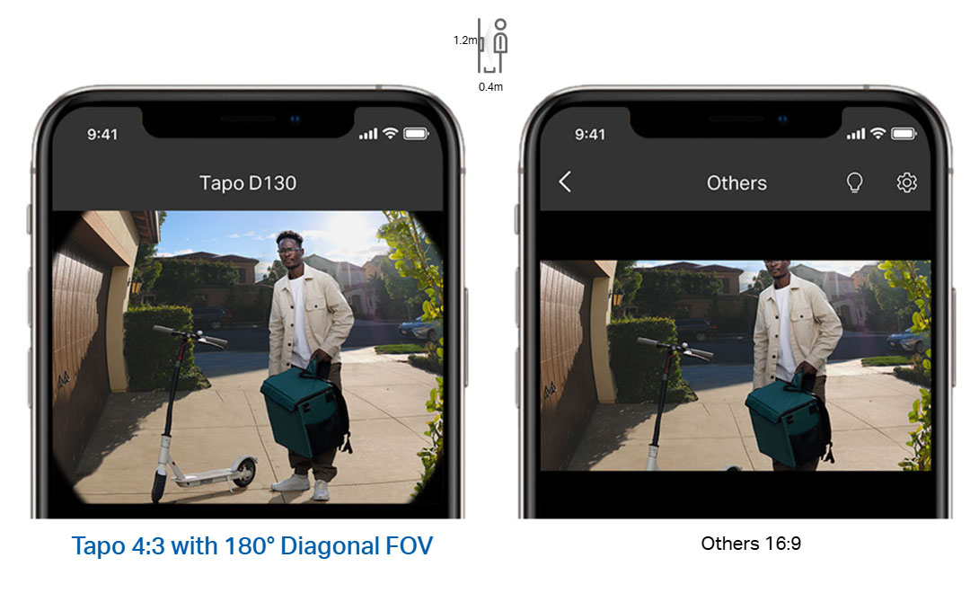 - Chế độ xem từ đầu đến chân: Với góc nhìn cực rộng (đường chéo 180°) của camera, chế độ xem trực tiếp Tapo 4:3 đảm bảo người dùng có thể kiểm tra khách từ đầu đến chân, hiển thị nhiều chi tiết theo chiều dọc hơn so với các chuông cửa 16:9 khác.